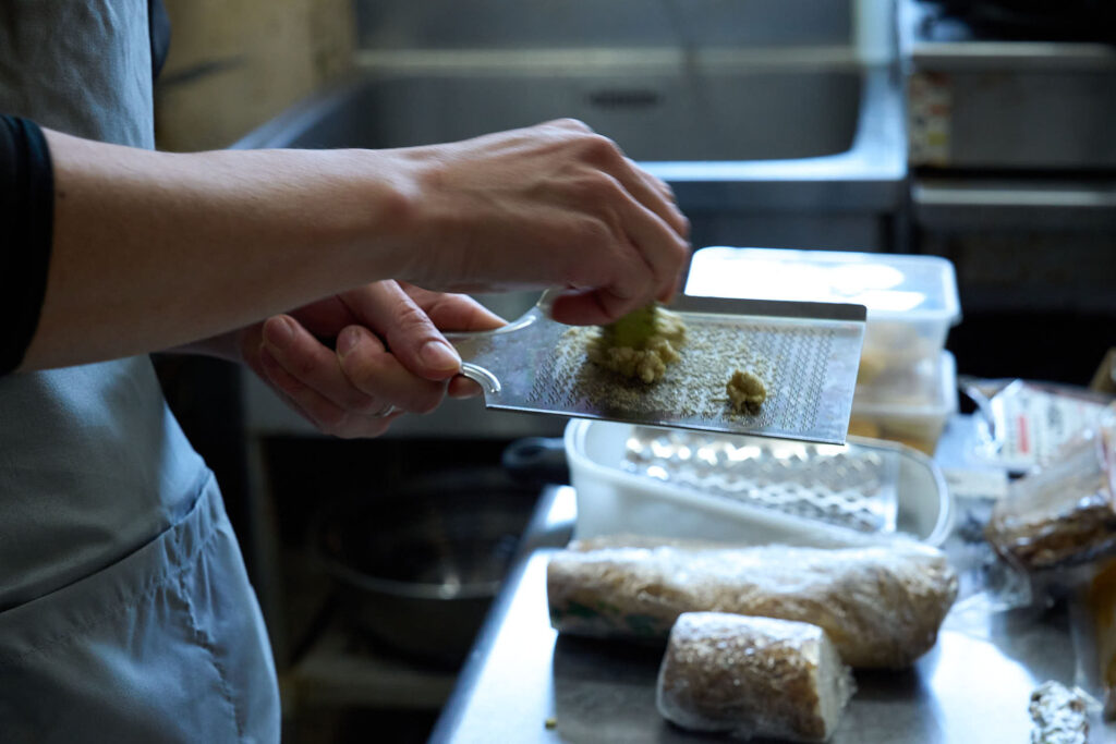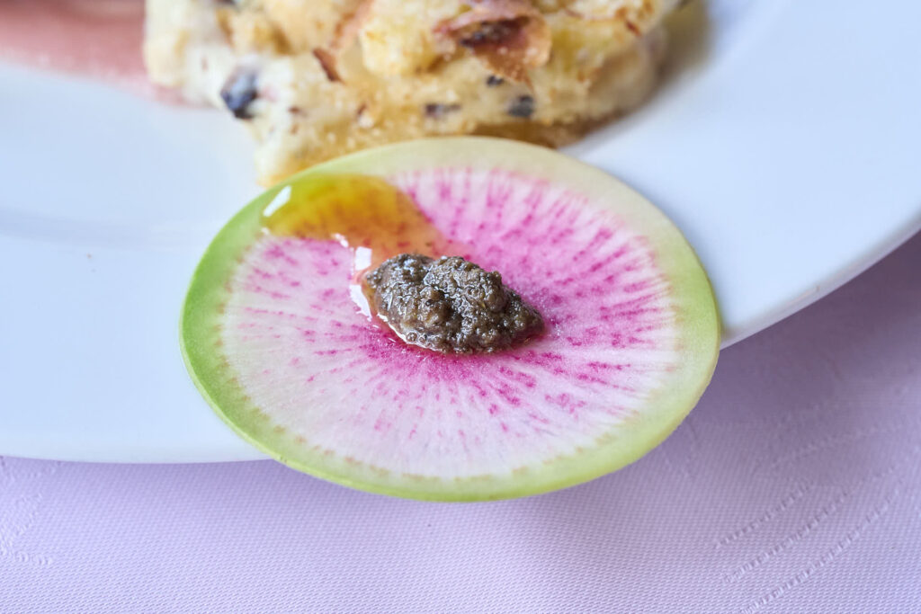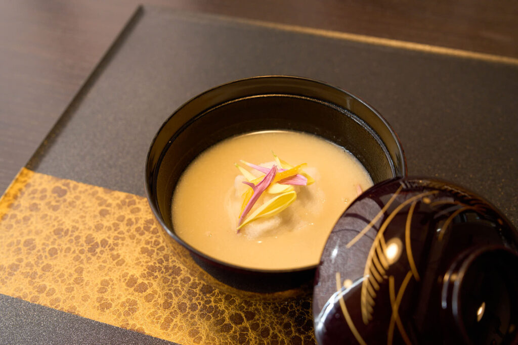 鰹出汁、自然薯、山葵を使った蔦木シェフによる和の一皿が披露され、最後には専門家である藪崎シェフも交えた活発な意見交換が行われました。
