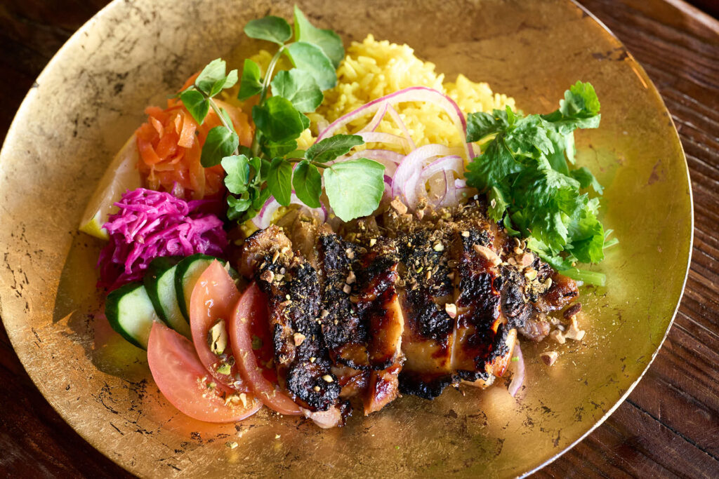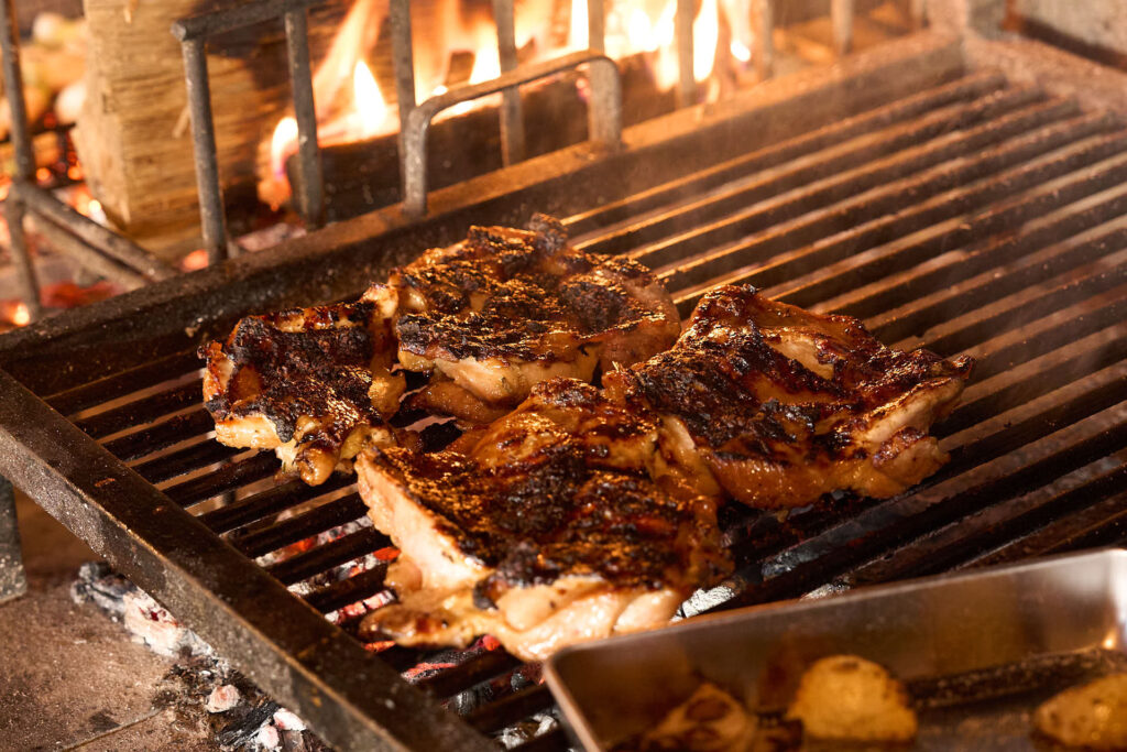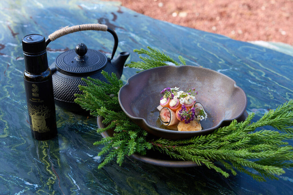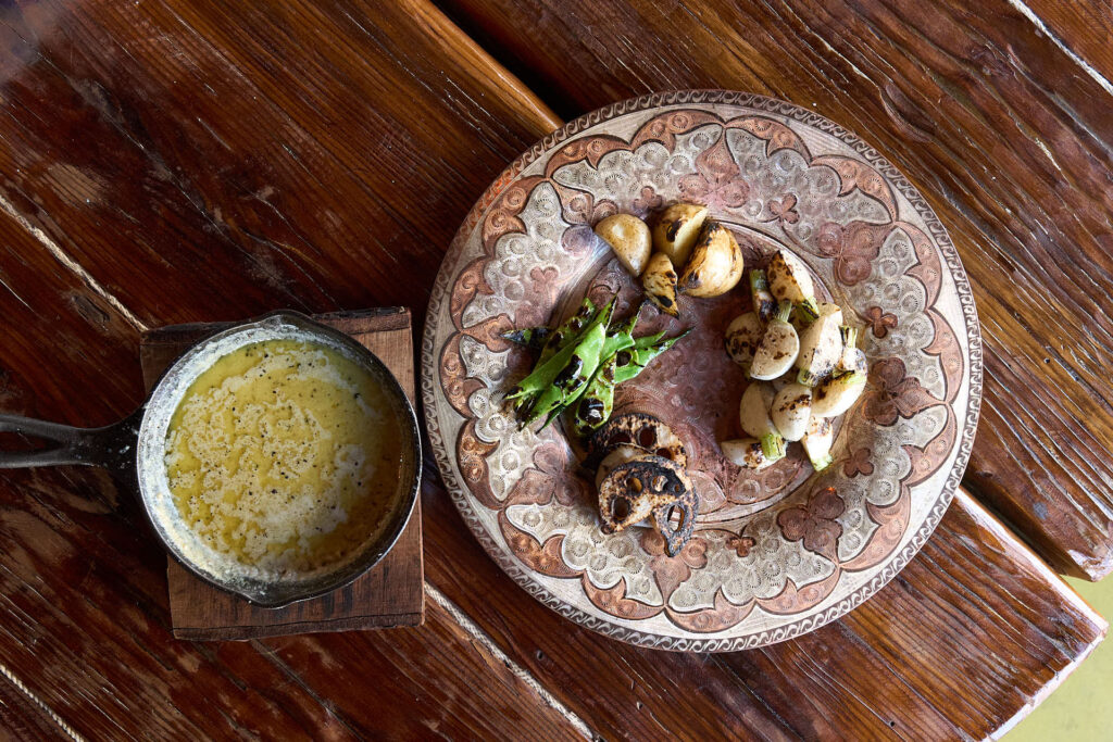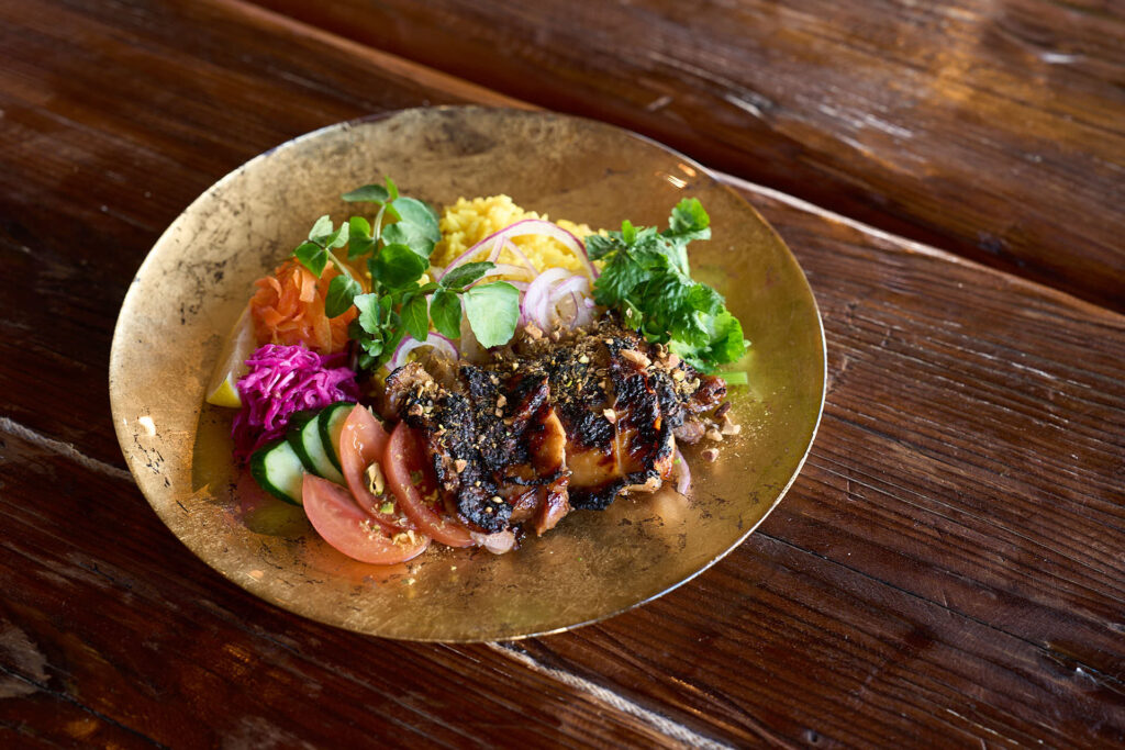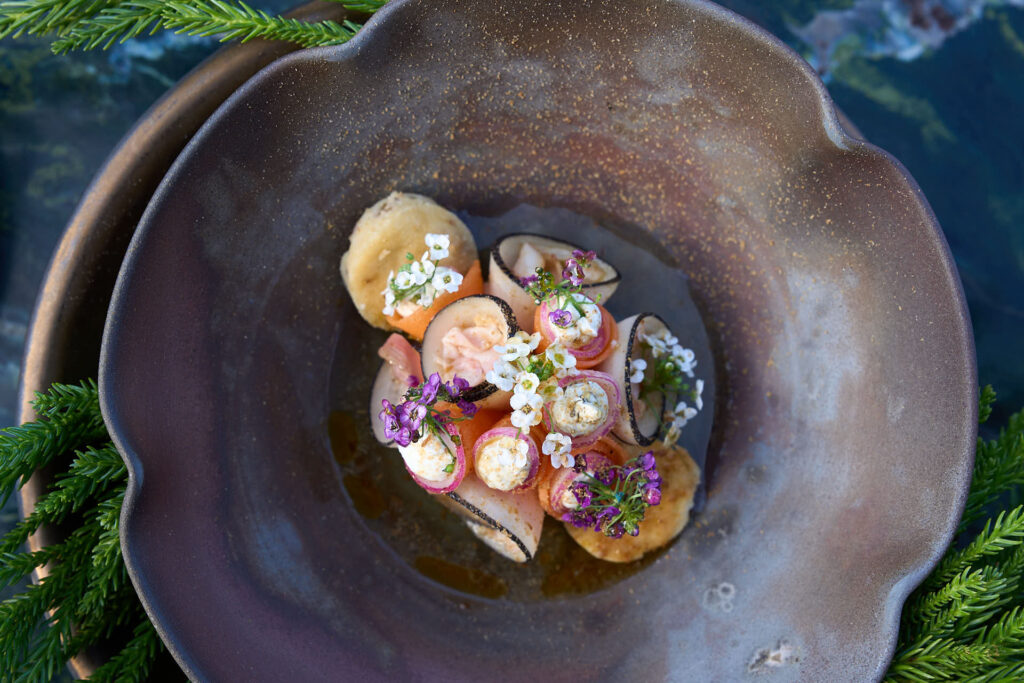 松本潤一郎シェフによる、薪火のエネルギーを活かした力強い料理が登場。クエビコは「薪火と森の循環」をテーマにしており、地域の自然環境そのものを味わうような体験が提案されました。塩鰹を使用したディップソース、かつお醤油のエッセンスが効いた地鶏の薪火焼きが供されました。 - 蔦木正道シェフ|至善天遊(西伊豆町)