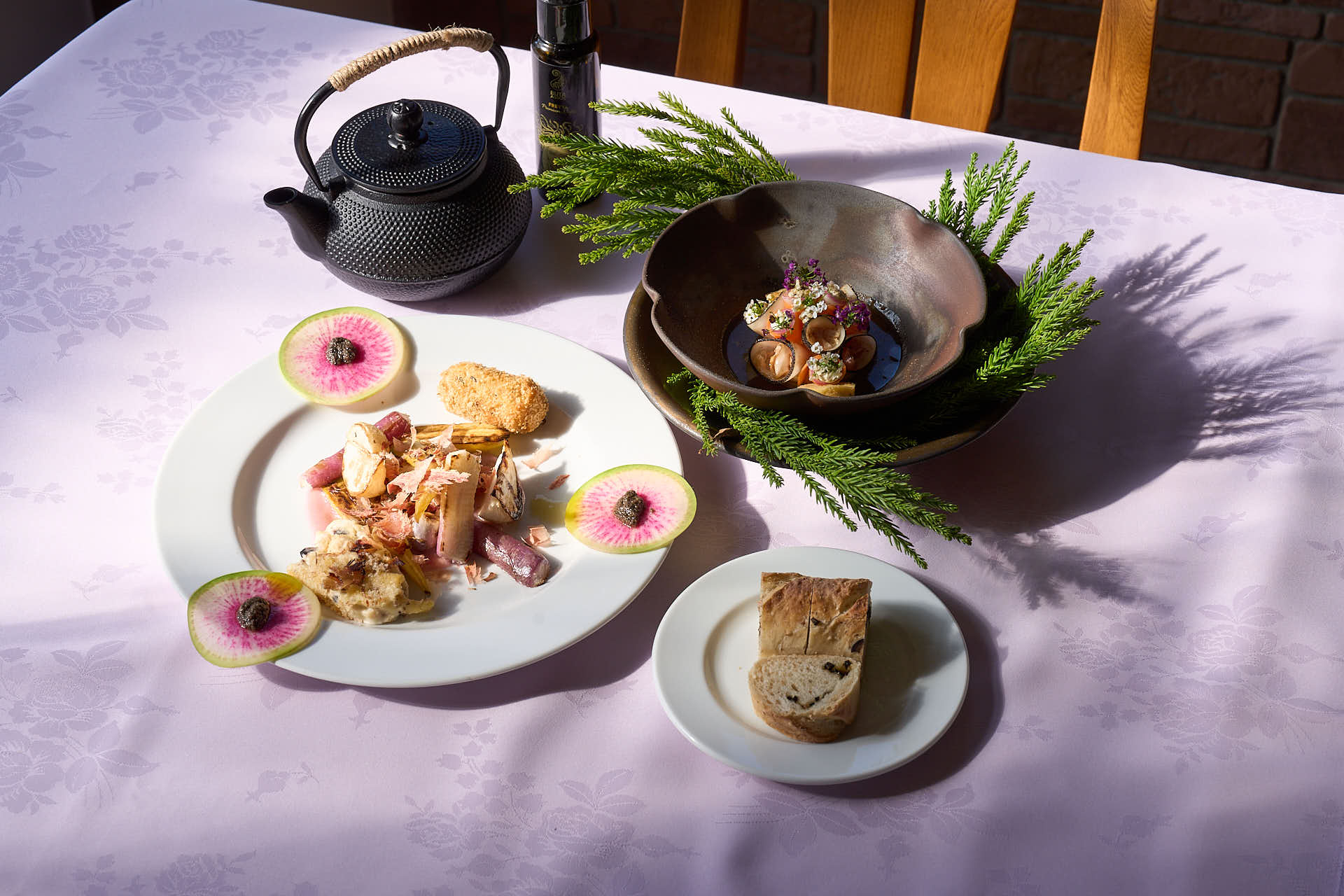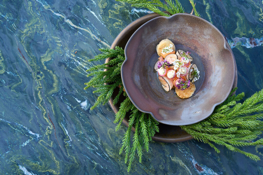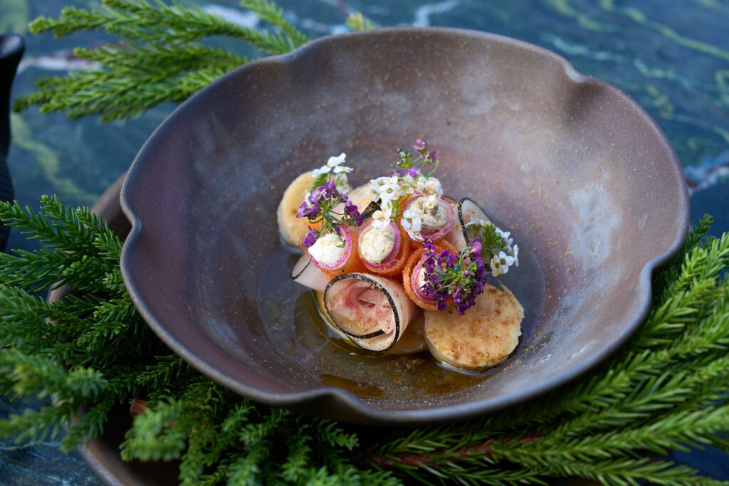 潮かつおや自然薯、レモングラス、ジビエのベーコンといった地元食材が、シェフの技で洗練された一皿へと昇華されました。 - 松本潤一郎シェフ|薪火レストラン クエビコ(松崎町)