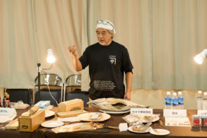 松本潤一郎シェフによる、薪火のエネルギーを活かした力強い料理が登場。クエビコは「薪火と森の循環」をテーマにしており、地域の自然環境そのものを味わうような体験が提案されました。塩鰹を使用したディップソース、かつお醤油のエッセンスが効いた地鶏の薪火焼きが供されました。 - 蔦木正道シェフ|至善天遊(西伊豆町)